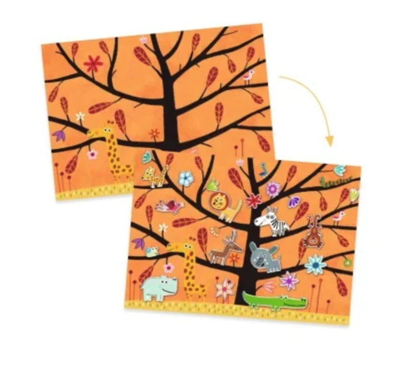 Een groot creatief mapje om op een leuke manier originele en grappige scènes rond het spel voetje van de vloer te maken! Met meer dan 30 dikke, verplaatsbare stickers en 2 grote geïllustreerde achtergronden, in de savanne of het bos, kunnen kinderen leuke en avontuurlijke scènes verzinnen