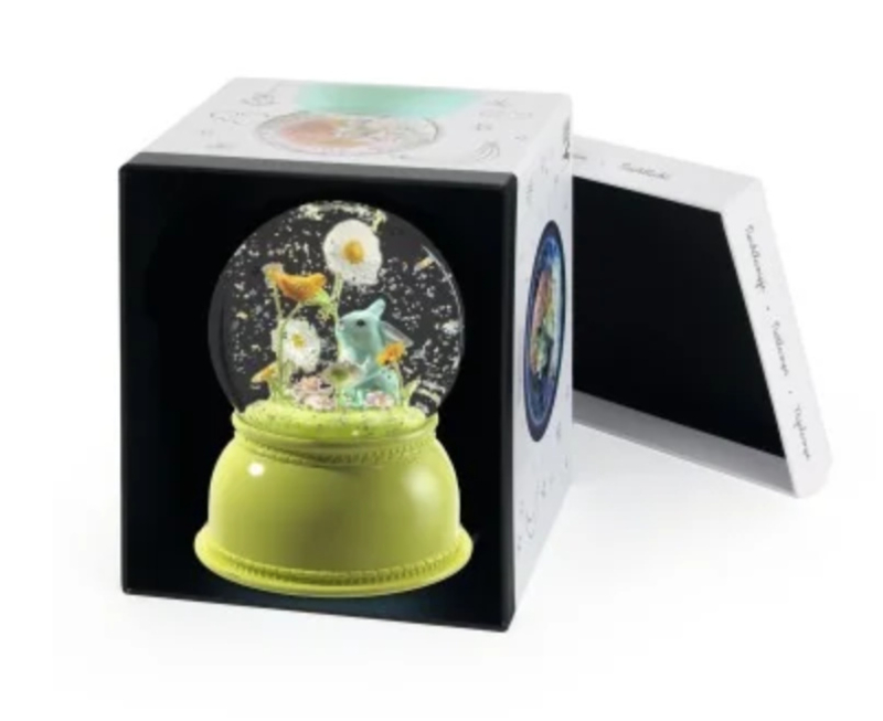Een glinsterend nachtlampje in de vorm van een sneeuwbal met een prachtig konijntje. Dit nachtlampje is gevuld met glitters en heeft een stil mechanisme dat de glitters laat wervelen en een discreet licht afgeeft dat van kleur verandert. Voor rustige en kalmerende nachten.