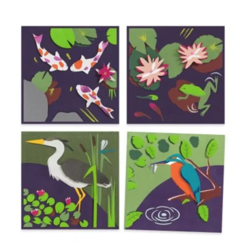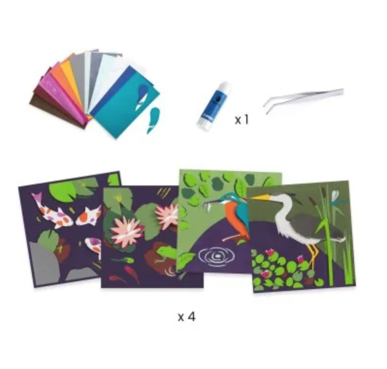 Met een precisietang, lijm en zelfklevende foam zetten kinderen de met laser voorgesneden papieren vormen in elkaar en leggen ze deze op elkaar om 4 schilderijen in reliëf te maken. Ze kunnen zelfs de kleinste details toevoegen met transferstickers voor extra eenvoud. Met reliëf-, metallic of parelmoerpapier kunnen de gemaakte scènes worden versierd met verschillende effecten voor een nog levendiger en bewonderenswaardiger resultaat!