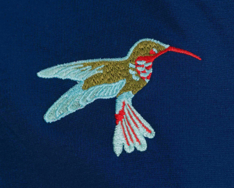 De Nora-jas is een bomberjack met functionele zakken die afsluiten met een onzichtbare rits en een goudkleurige ritssluiting aan de voorkant die terugkomt in de gestreepte manchetten en zomen. Gemaakt van een unieke mix van biologisch katoen en gerecycled polyester in de kleur Punta di Roma Navy, is de jas afgewerkt met op de natuur geïnspireerde borduursels op de borst.
