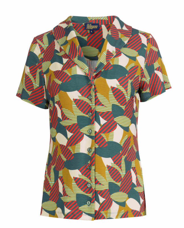 De Iris blouse heeft een zacht afgeronde sjaalkraag en een sluiting met één knoop. De blouse is gemaakt van zachte en elastische ECOVERO™ viscose en verfraaid met de warme kleuren van de bladprint.