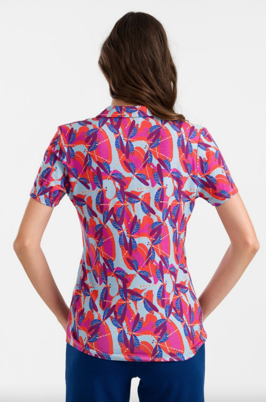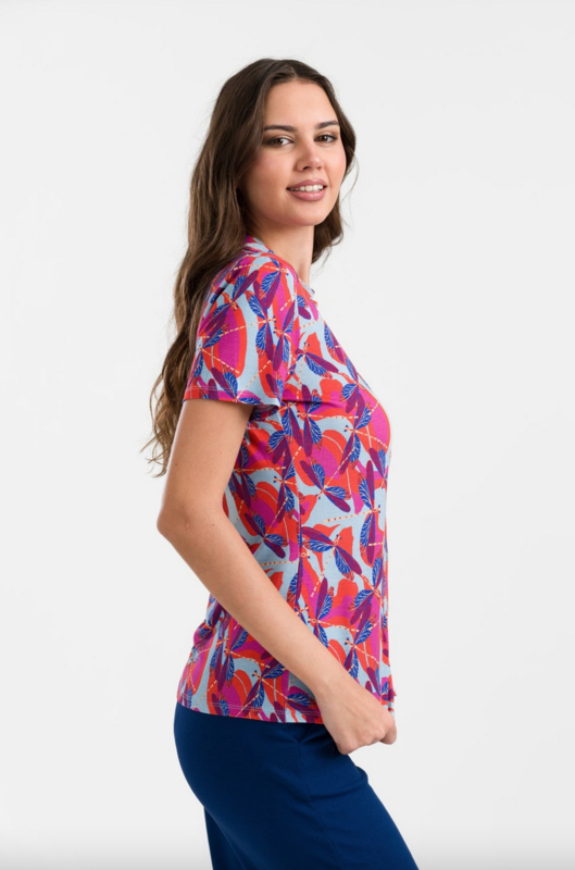 De Lena blouse met korte mouwen is gemaakt van ECOVERO™ viscose jersey en heeft een V-hals met knoopsluiting en een overhemdkraag. De blouse is bedrukt met ons Dragonfly Disco-patroon, waarmee je de energie van de natuur in je garderobe brengt.