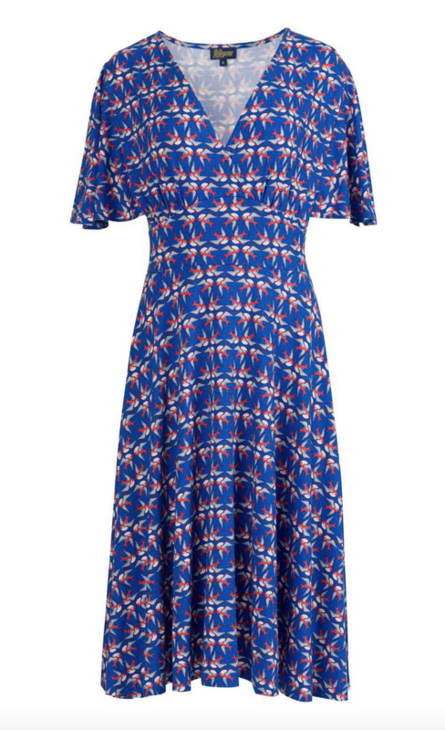 De Luna-jurk is gemaakt van zachte, elastische ECOVERO™ viscose jersey en kenmerkt zich door een elegant golvende rok en een dubbele V-hals, afgewerkt met de Dragonfly Free Bird om de energie van natuurlijke bloemen in je dagelijkse outfit te brengen.