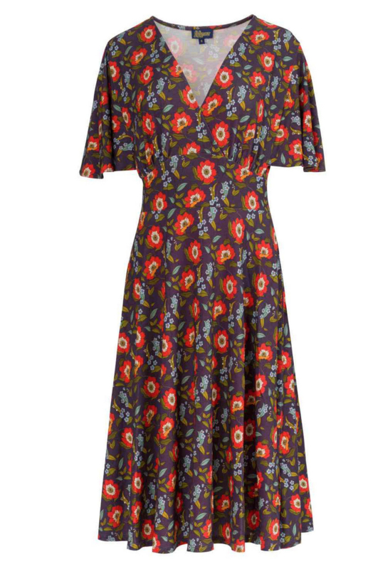 De Luna-jurk is gemaakt van zachte, elastische ECOVERO™ viscose jersey en kenmerkt zich door een elegant golvende rok en een dubbele V-hals, afgewerkt met een paarse klaprozenprint die de warmte van lentebloemen in je dagelijkse outfit brengt.