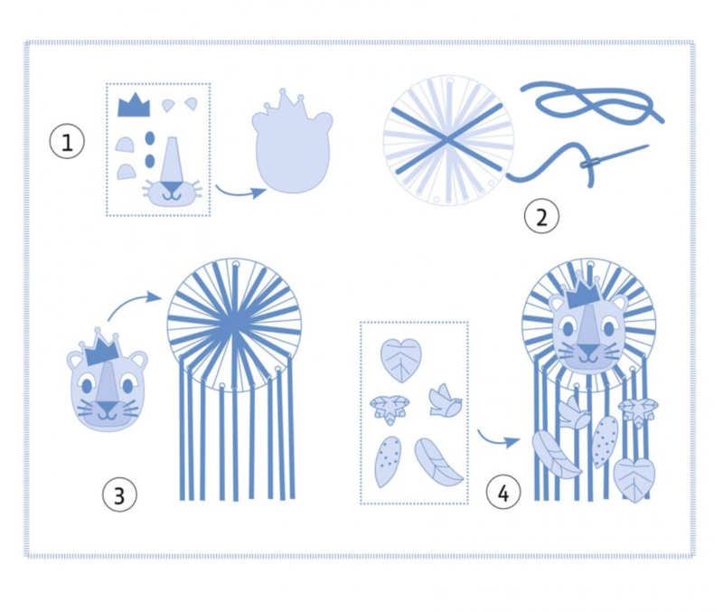 Een knutselset speciaal voor jonge kinderen, vanaf 4 jaar, om een mooie dromenvanger te maken. Het kind versiert de leeuw met linten en gekleurde draden en gebruikt vervolgens dikke stickers om de basis te versieren. Een mooi decoratief voorwerp om in je kamer op te hangen en boze dromen te verjagen...