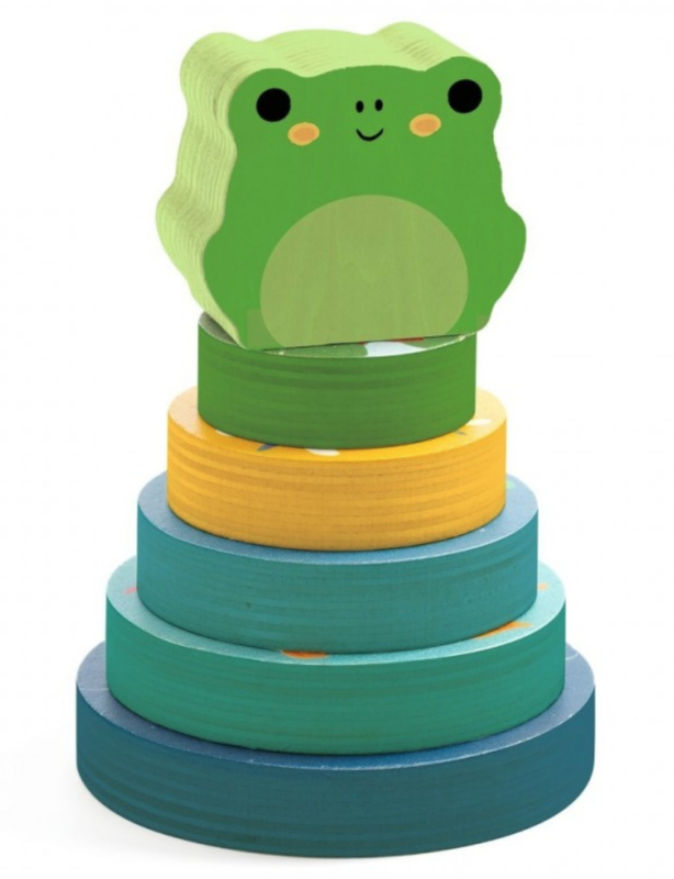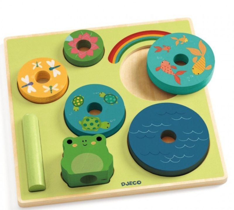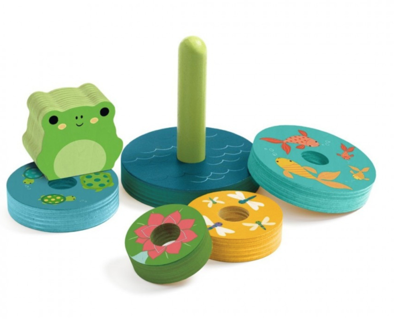 Puzz & Stack is een eenvoudige houten puzzel en een stapelspel. De stukken worden op de houten spil gestapeld om een mooie bloemenpiramide te vormen met op de punt een kikkertje.